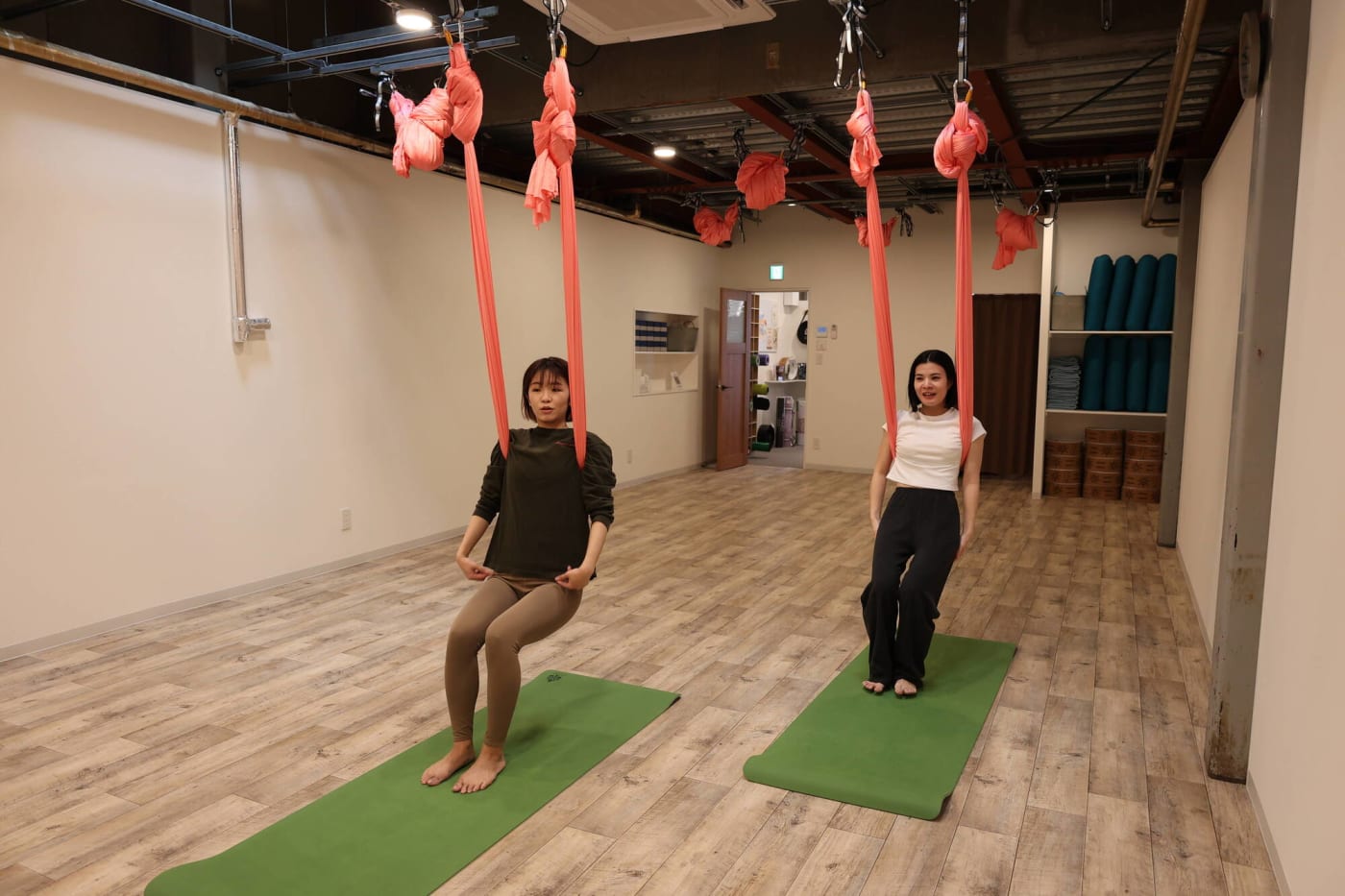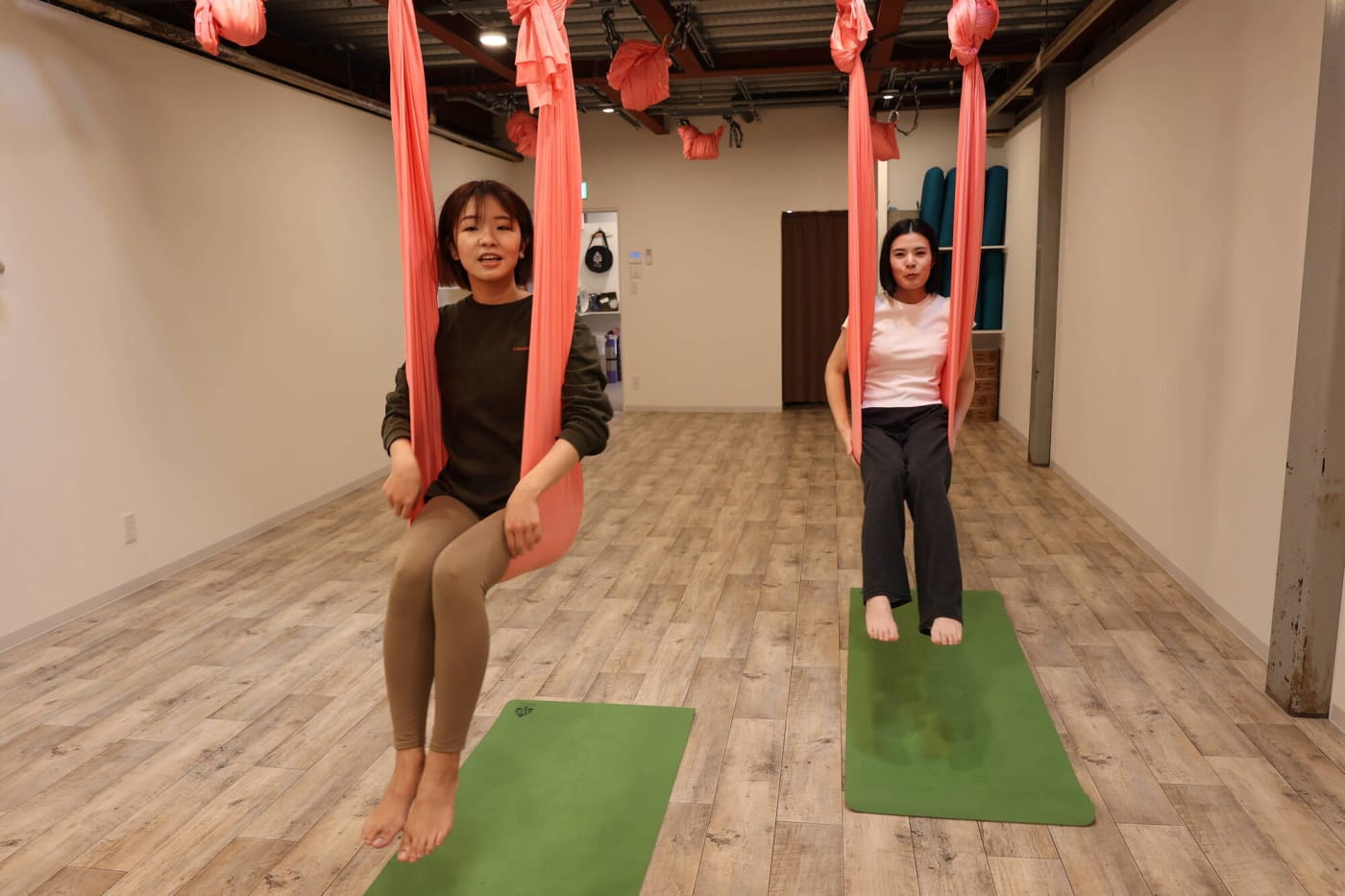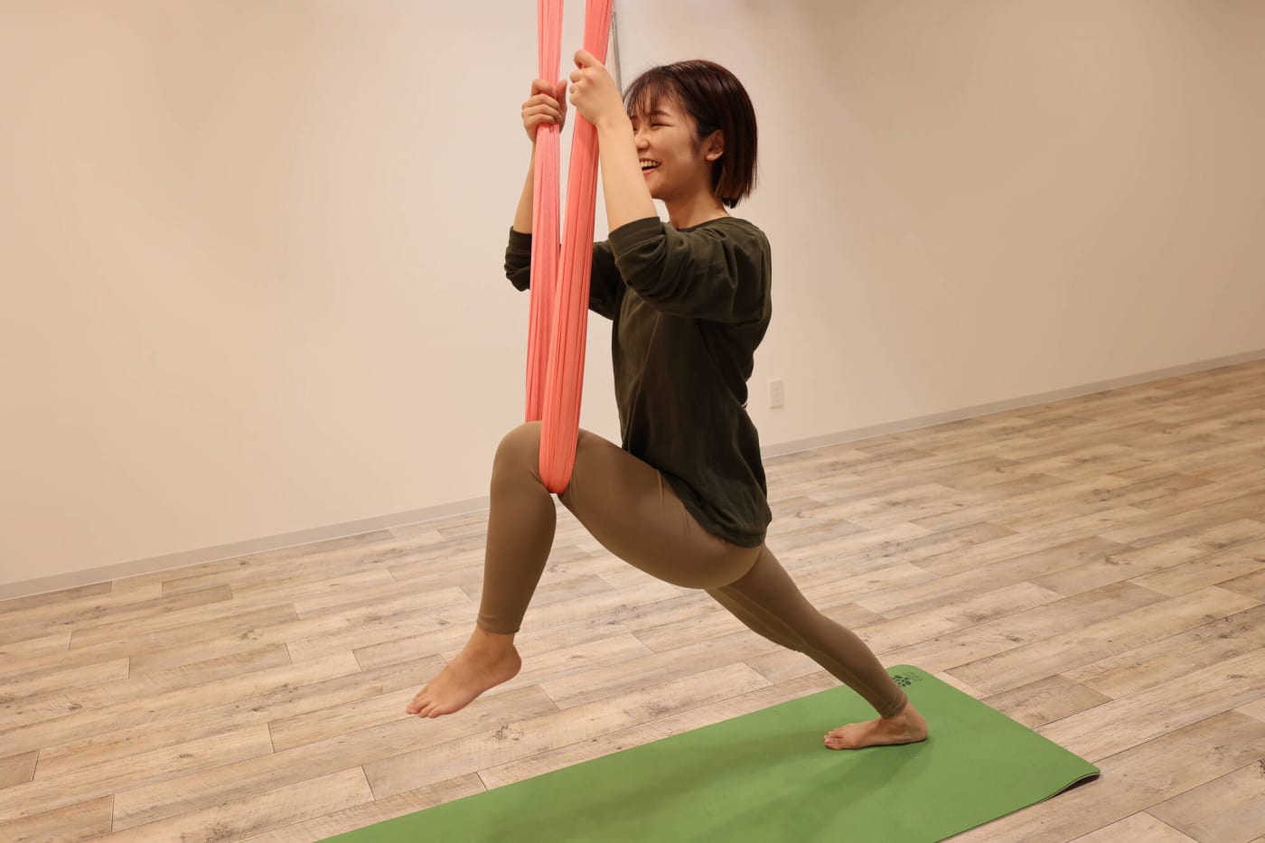 まるでブランコに乗っているかのよう……。布がしっかりと支えてくれるので骨盤がギュッと締まる感覚がありました。足が床から浮いている高さですが、とてもリラックスしています。