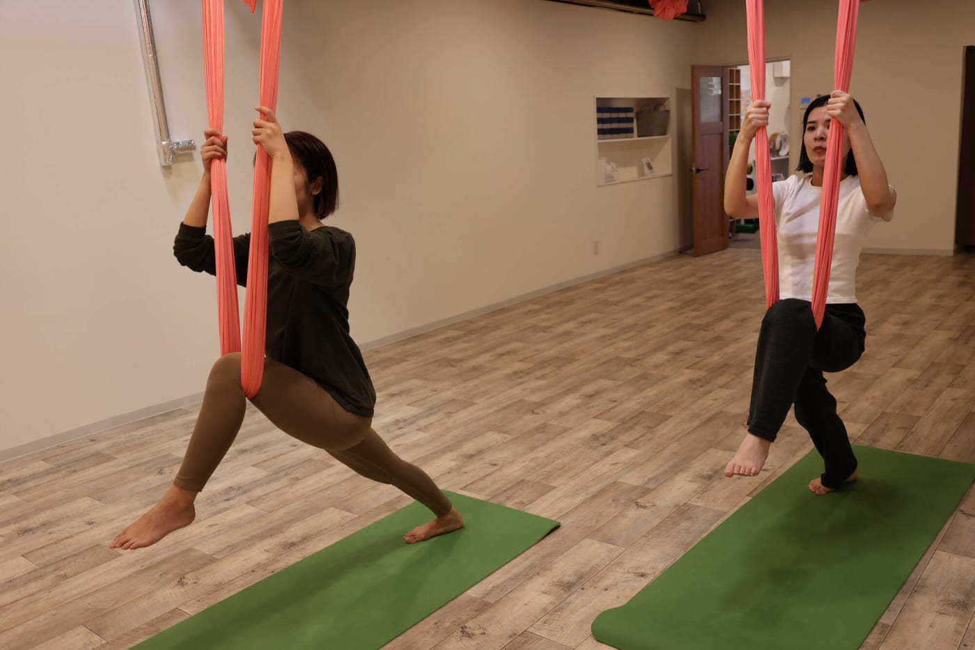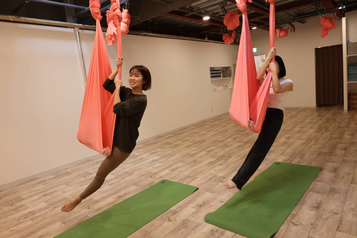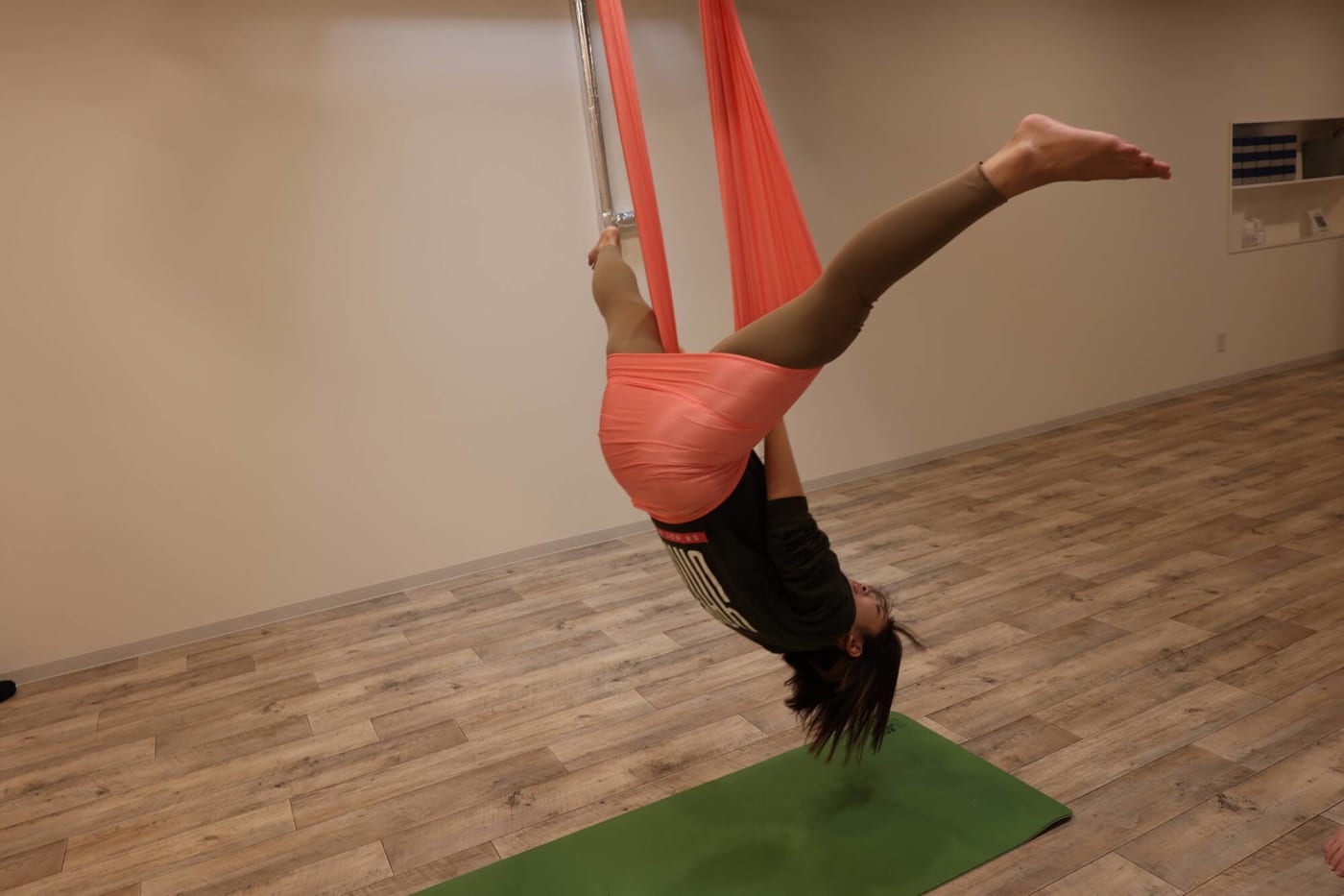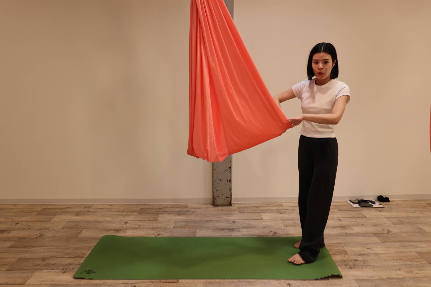 まるでブランコに乗っているかのよう……。布がしっかりと支えてくれるので骨盤がギュッと締まる感覚がありました。足が床から浮いている高さですが、とてもリラックスしています。
