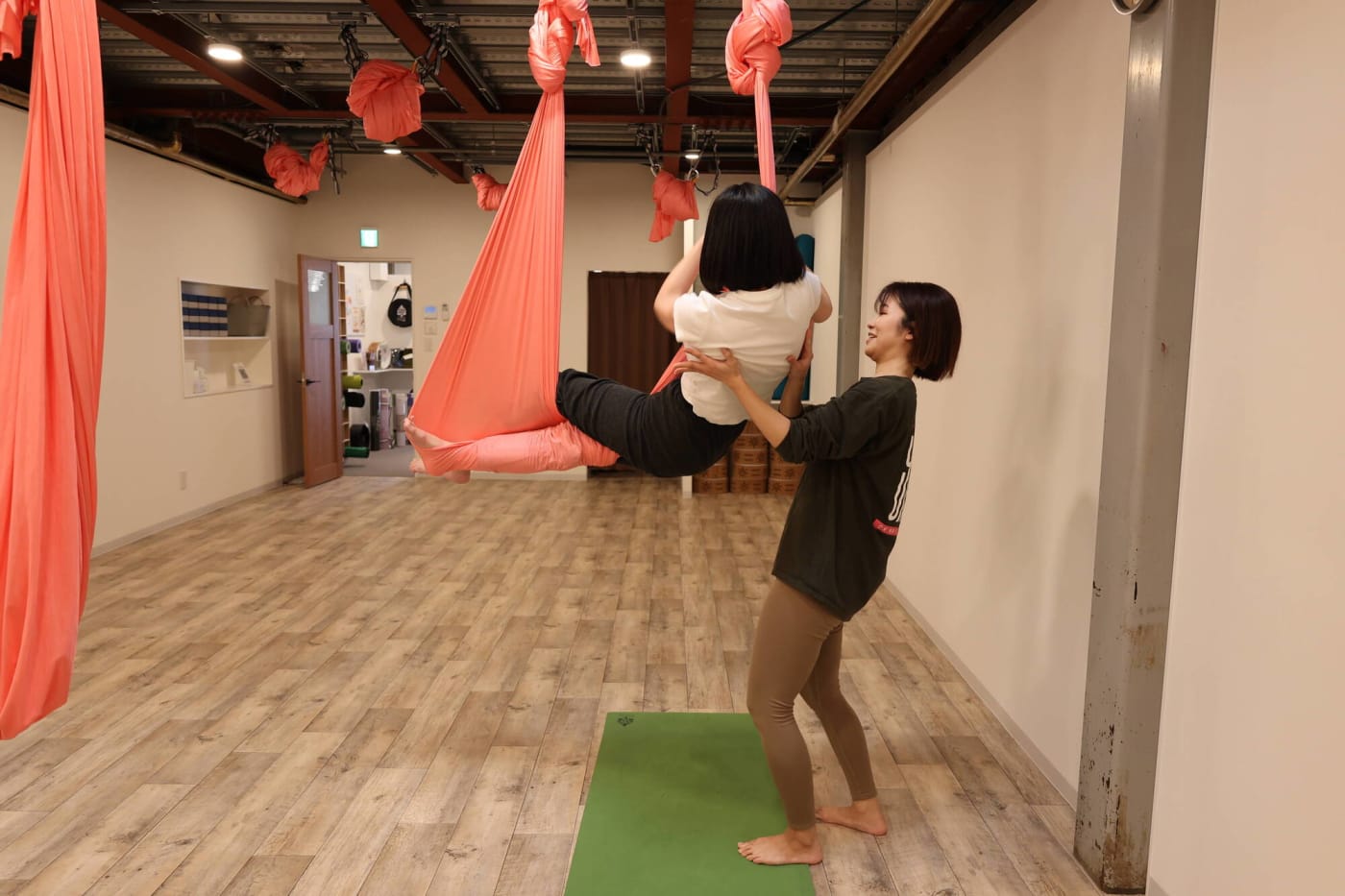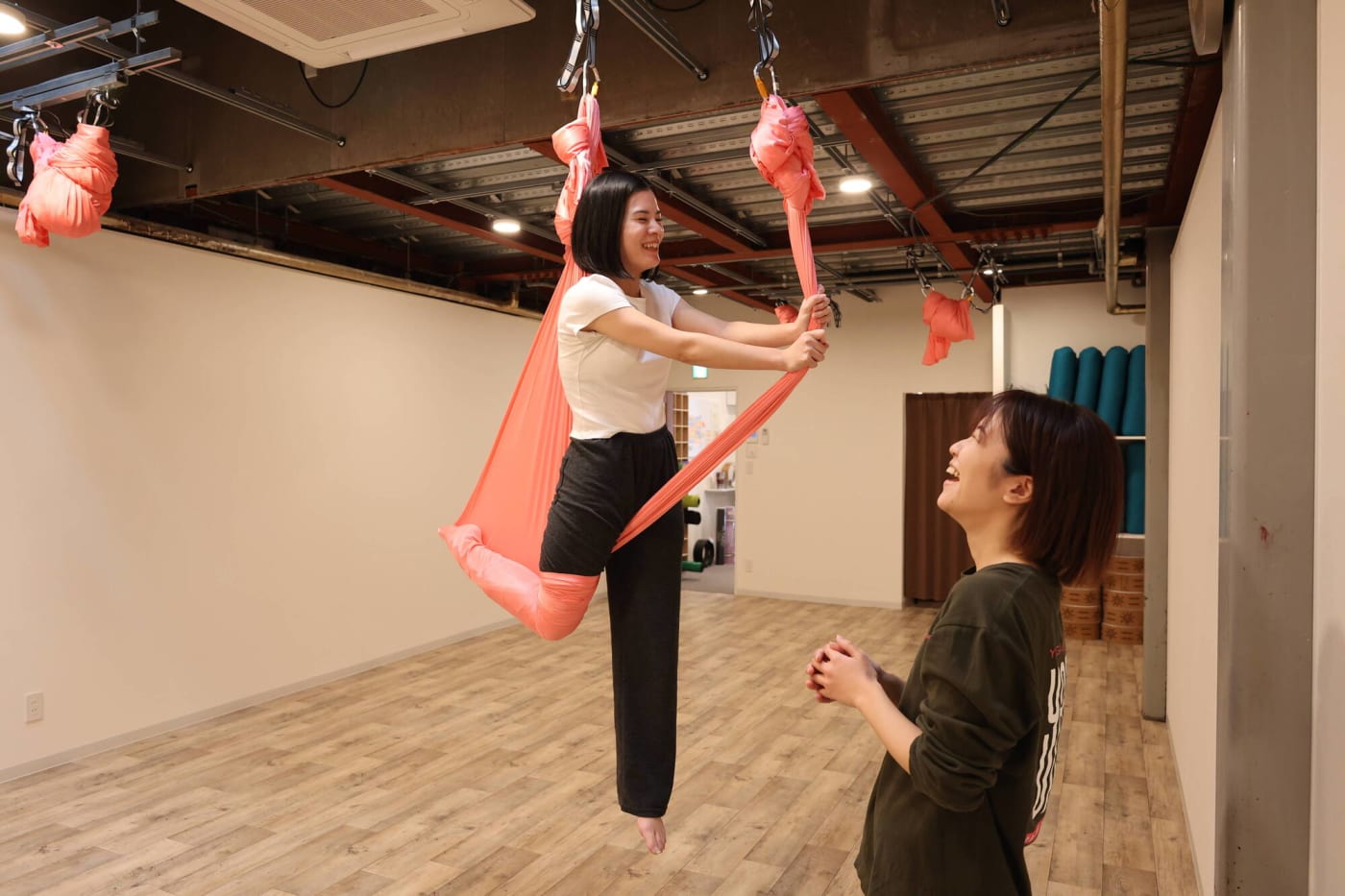 床に足がつかない位置まで上がりますが、恐怖心などはなく爽快感で満たされます。先生がしっかりサポートしてくださるので、安心してポーズに挑戦できました。