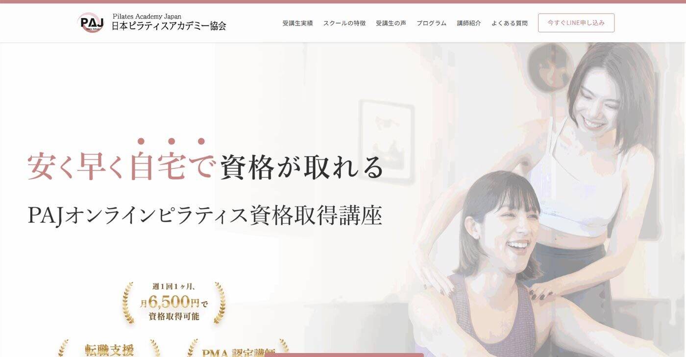 日本ピラティスアカデミー協会(PAJ)は超実践型オンライン講座を展開し、マシンピラティスに特化した短期取得が可能な協会です。指導者の育成活動においてはオンライン講座のみで1ヶ月、オンライン+実技で2ヶ月という効率的なカリキュラムを展開中です。
