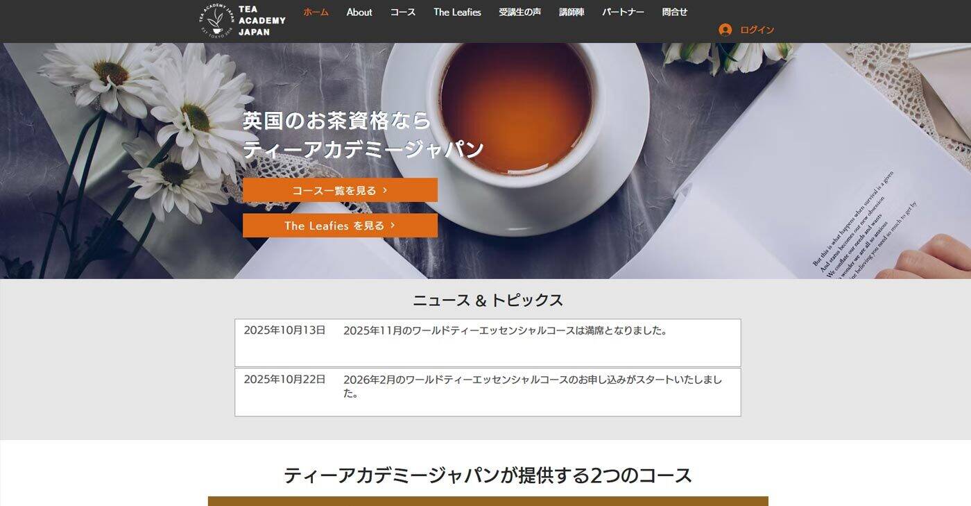 | 資格・講座内容 | ジュニアティーアナリスト(紅茶12講座)、プロフェッショナルティーアナリスト(紅茶7講座+試験)、日本茶ティーアナリスト(5講座)、日本茶プロフェッショナル講座など |