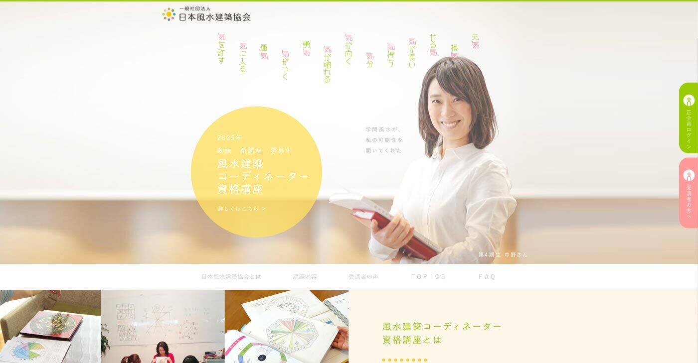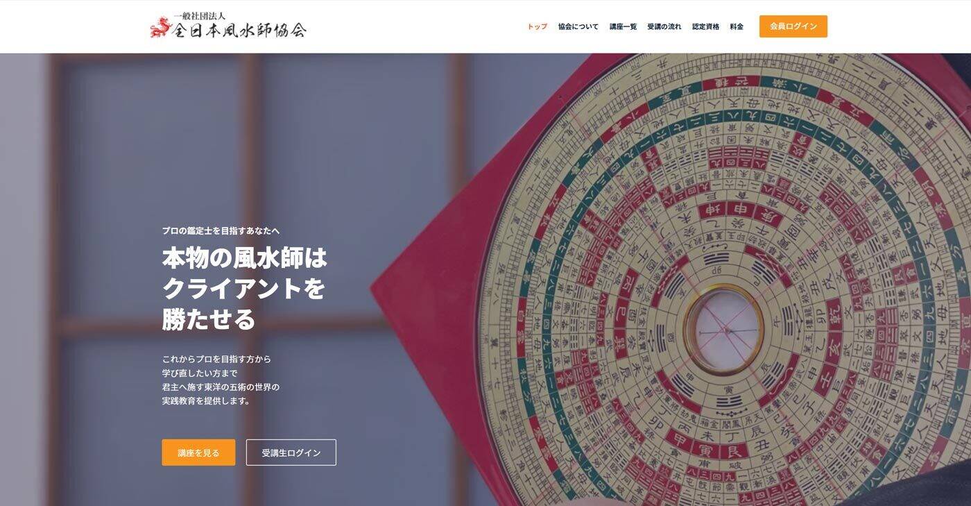 | 資格・講座内容 | 風水師資格:講座修了後に修了認定、資格認定試験を経て協会認定資格を取得 |