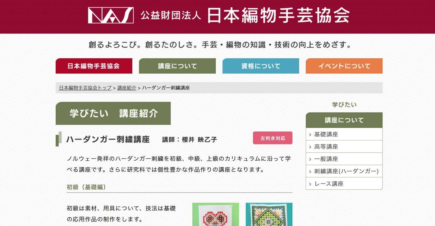 公益財団法人 日本編物手芸協会は、ハーダンガー刺繍に特化した講座を提供しています。基礎から応用まで学べるカリキュラムが整っており、初心者でも安心して参加できます。